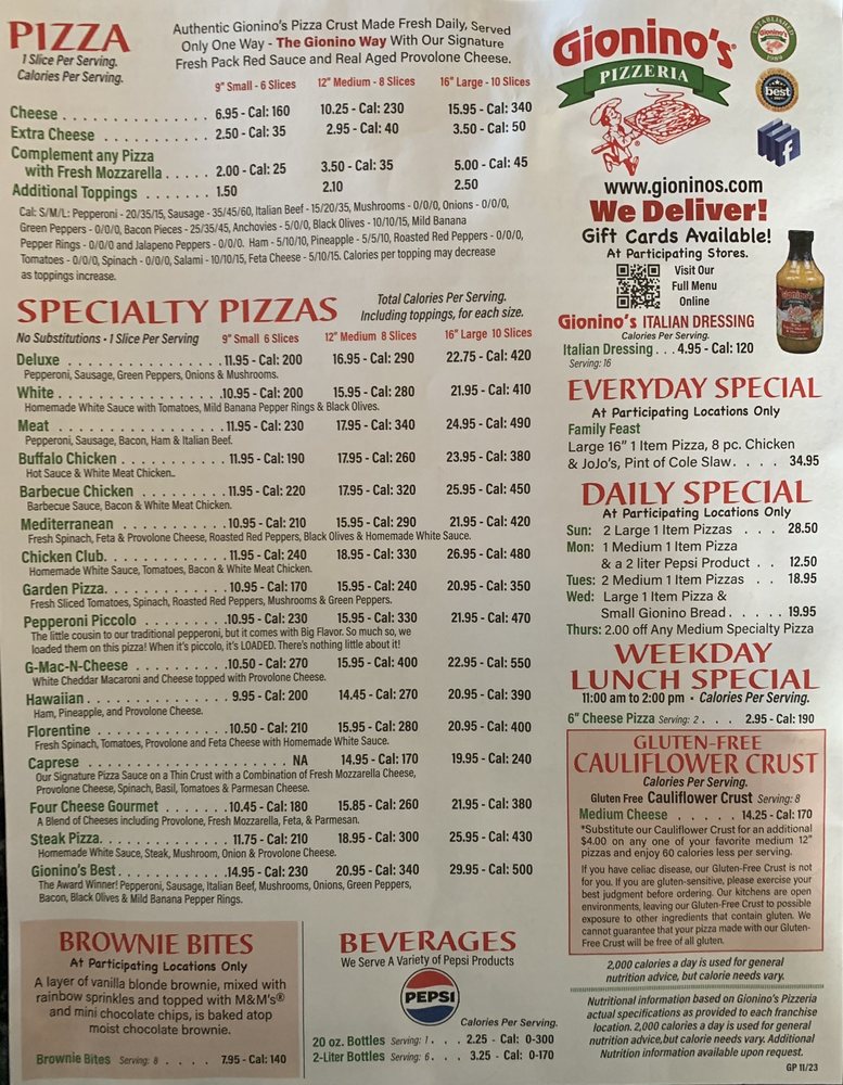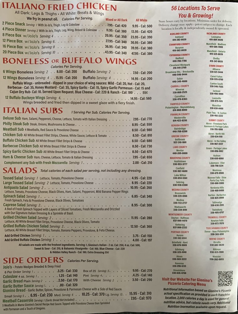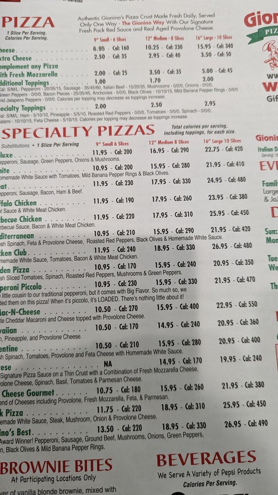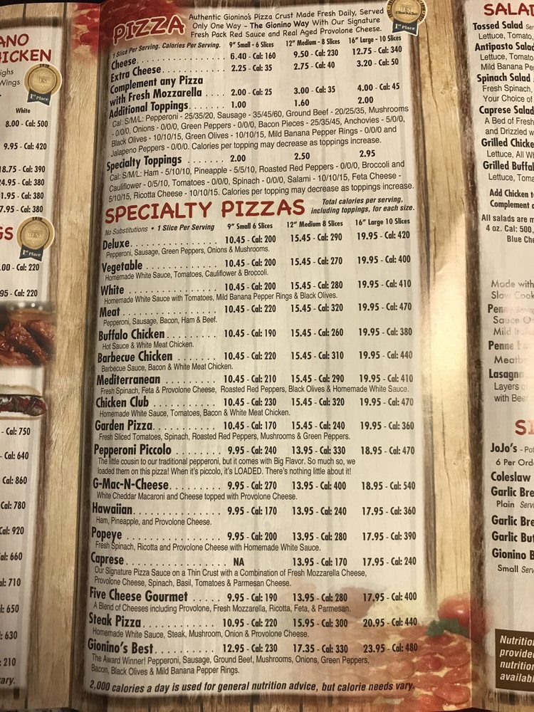Welcome to Gionino's Pizzeria Pickerington, a hidden gem located at 12983 Stonecreek Dr in Pickerington, OH. This delightful pizzeria serves up an extensive menu that is sure to tantalize your taste buds. From their crispy, handcrafted pizzas to hearty sandwiches, the focus is on quality ingredients and exceptional flavors. Don't miss the famous JoJos Potato Wedges, perfectly breaded and deep-fried to golden perfection, and the savory Meatball Casserole smothered in garlic butter sauce.